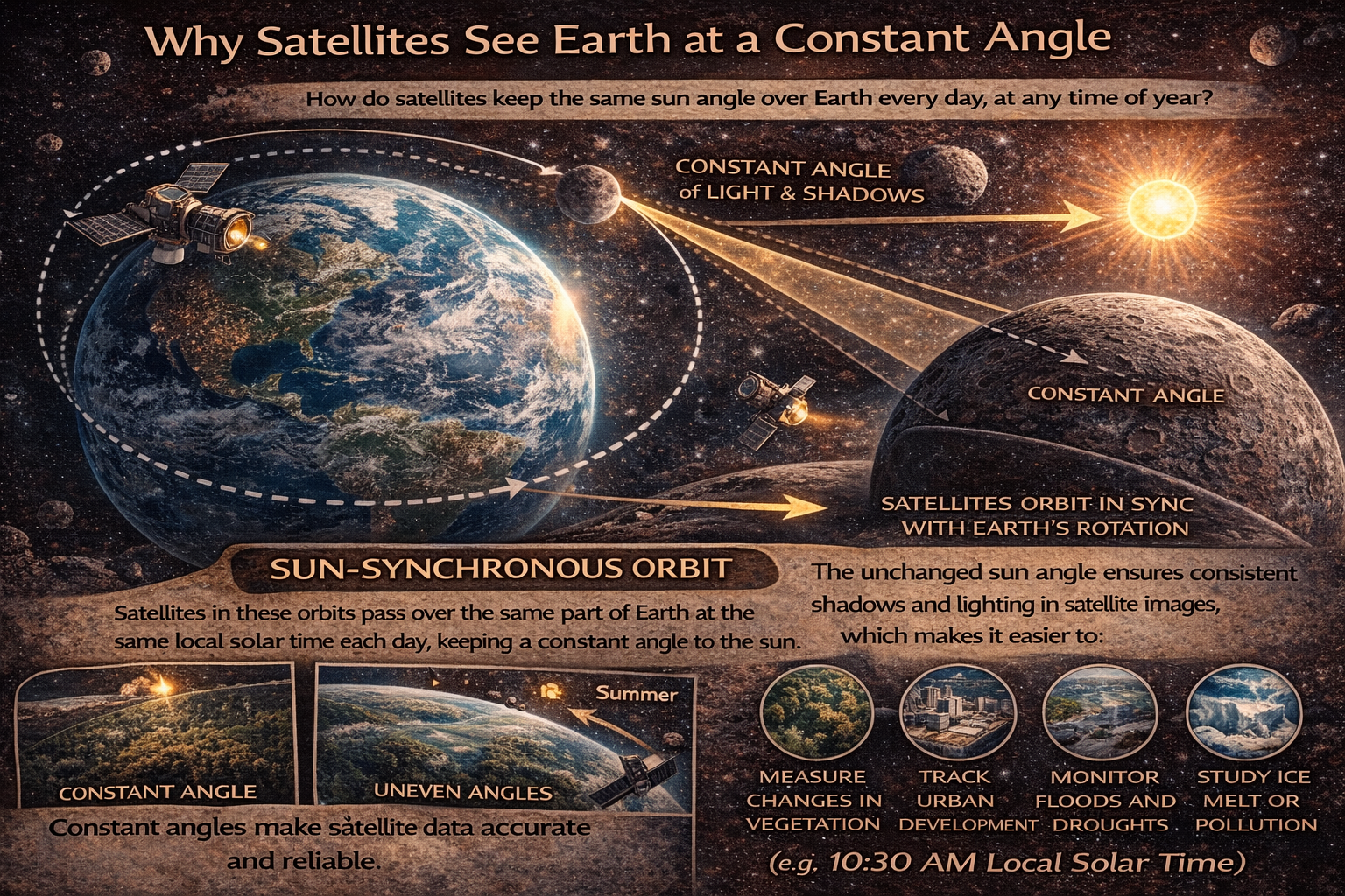 태양동기궤도는 위성이 지구를 도는 동안 항상 같은 태양 각도에서 지표를 바라보도록 설계된 궤도다. 예를 들어, 위성이 서울 상공을 지날 때 언제나 오전 10시쯤의 햇빛 조건으로 관측하도록 맞춰진다. 이렇게 하면 그림자 길이와 빛의 방향이 일정해진다.
