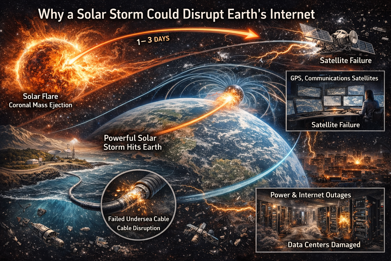 인터넷 자체는 우주에 떠 있는 것이 아니라, 해저 케이블·지상 광케이블·위성으로 구성되어 있다. 특히 대륙 간 인터넷의 핵심은 바닷속에 깔린 해저 케이블이다. 태양 폭풍이 유발한 지자기 폭풍은 해저 케이블의 중계 장비에 과부하를 일으켜 신호 증폭기를 손상시킬 수 있다. 이 장비는 교체에 수주에서 수개월이 걸린다.