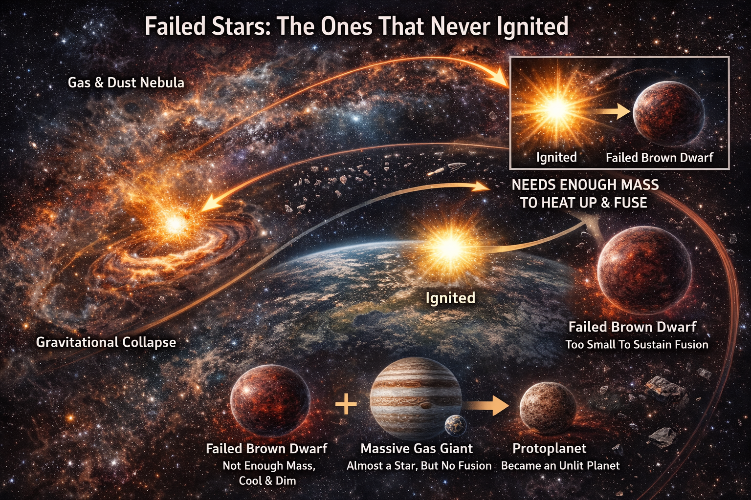 별이 태어나지 못하고 사라지는 실패한 별들밤하늘의 별들은 모두 찬란하게 태어난 존재처럼 보인다. 하지만 우주에는 끝내 별이 되지 못한 채 어둠 속에 머무는 천체들이 있다. 이들은 흔히 ‘실패한 별’이라 불린다. 태어나는 과정은 별과 거의 같지만, 결정적인 순간을 넘지 못한 존재들이다. 별은 어떻게 태어날까별의 시작은 거대한 가스와 먼지 구름이다. 이 구름이 중력에 의해 서서히 수축하면 중심부의 온도와 압력이 점점 높아진다. 중심 온도가 약 1천만 도를 넘으면 수소 핵융합이 시작되고, 이 순간부터 비로소 별은 스스로 빛을 내기 시작한다. 이 핵융합이 바로 별의 생명이다.실패는 질량에서 갈린다하지만 모든 가스 구름이 이 조건을 만족하는 것은 아니다. 가장 큰 문제는 질량 부족이다. 구름의 질량이 충분히 크지..