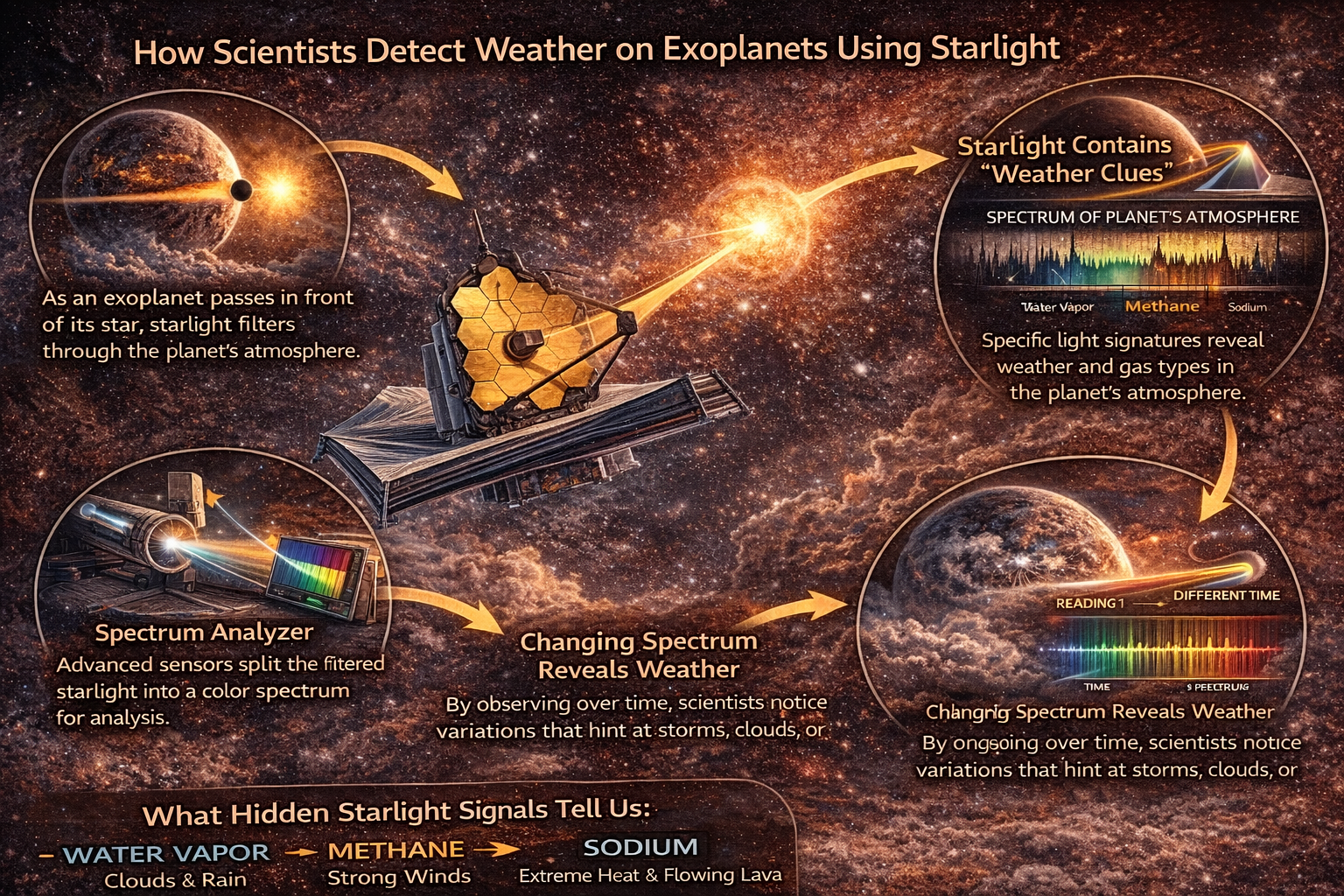 외계행성은 대부분 너무 작고 어두워 직접 관측하기 힘들다. 대신 과학자들은 외계행성이 도는 중심별의 빛을 관찰한다. 행성이 별 앞을 지나갈 때, 별빛의 아주 일부가 행성의 대기를 통과해 우리에게 도달한다. 이때 빛은 대기의 성분과 상태에 따라 미묘하게 변한다.